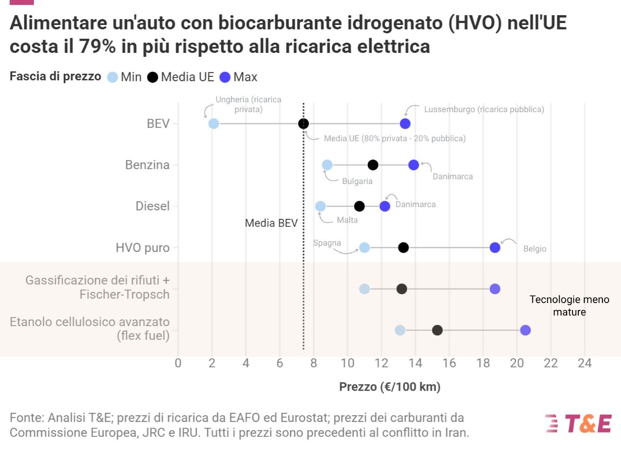In base a un'analisi effettuata dalla sigla indipendente T&E (Transport & Enviroment), fare 100 km con un'auto alimentata con HVO costerebbe circa il 52% in più rispetto alla ricarica elettrica. La panoramica, alla luce delle normative UE