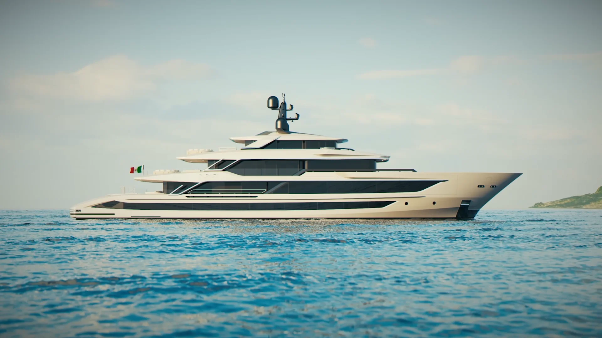 La timoneria è posizionata sul sun deck, dove si trovano anche la cabina del comandante, un’ulteriore area pranzo e ampie zone prendisole a prua e a poppa. Il garage, collocato a prua del main deck, può ospitare un tender da 23 piedi, due jet ski e un rescue tender. Sempre a prua è presente una piattaforma touch-and-go per l’elicottero.