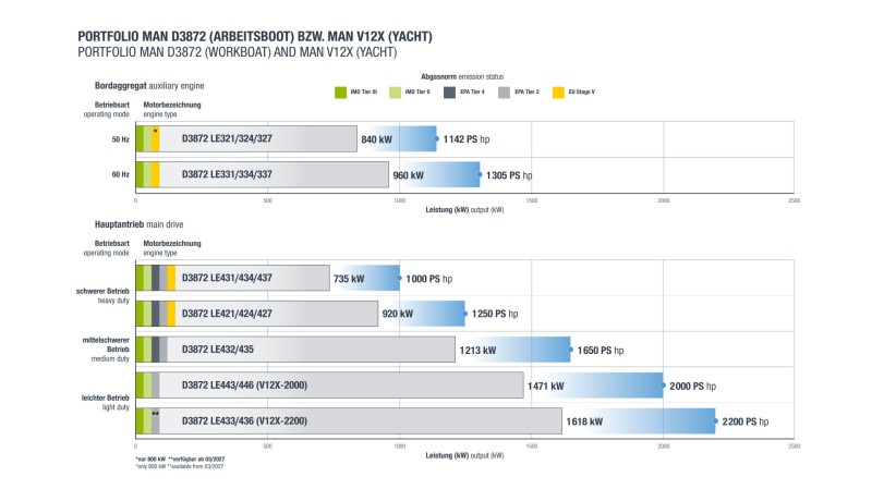 Numerose, infine, le applicazioni marittime e stazionarie in cui la nuova soluzione MAN Engines può trovare applicazione. Nel settore delle imbarcazioni da lavoro, la famiglia di motori D3872 si è affermata come sistema di propulsione principale potente e affidabile. Nel segmento degli yacht, il motore è stato recentemente introdotto come serie MAN V12X, dove offre livelli di potenza fino a 1.618 kW (2.200 CV). Inoltre, la piattaforma è alla base dei motori a gas fissi MAN E3872, utilizzati nel settore della produzione di energia elettrica.