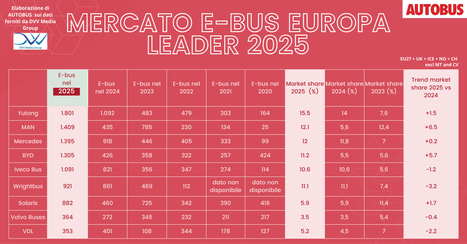 Il cambiamento più significativo nella classifica riguarda MAN, le cui immatricolazioni sono passate da 435 unità nel 2024 a 1.409 nel 2025, pari a una crescita del +224%. Questo incremento ha portato la quota di mercato del Leone dal 5,6% al 12,1%, facendolo salire al secondo posto nel mercato europeo. Daimler Buses ha registrato 1.395 immatricolazioni, rispetto alle 918 del 2024 (+52%). La quota di mercato è rimasta sostanzialmente stabile attorno al 12%, passando dall’11,8% al 12,0%.
