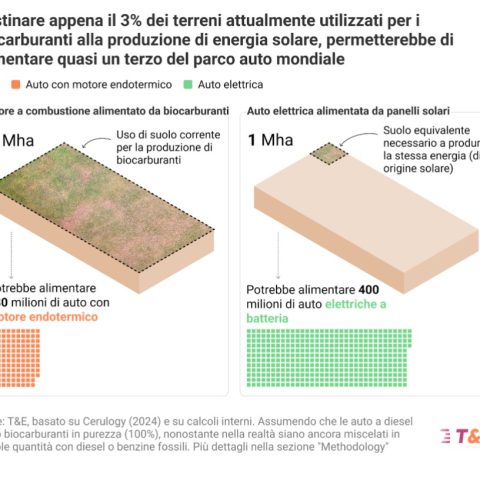 T&E sottolinea che la produzione di biocarburanti rappresenta anche uno spreco di suolo: restituendo alla natura le aree oggi destinate alle biomasse si potrebbero assorbire oltre 400 MtCO₂e ogni anno, mentre basterebbe appena il 3% di quei terreni per produrre la stessa quantità di energia tramite impianti solari. Grazie all’efficienza dei veicoli elettrici, quell’energia sarebbe sufficiente ad alimentare un terzo del parco auto mondiale.