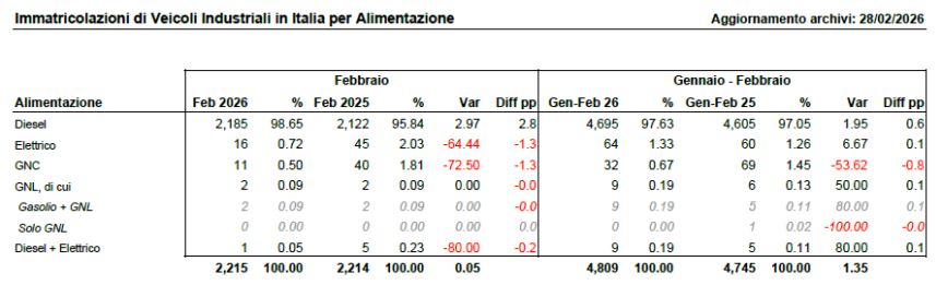 Tornando alle alimentazioni, il diesel ritrova il segno più, guadagnando il 2,97 nel mese (quota di mercato 98,65%) e l’1,95 nel bimestre dopo un 2025 in perdita netta (-4,85%) e un gennaio in leggero calo (-0,32%).